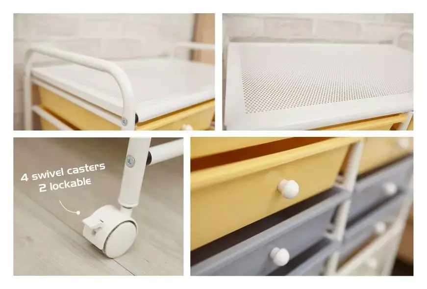 Der Schubladenwagen ist leicht und lässt sich problemlos in jede Ecke des Hauses rollen. Die Schubladen lassen sich einfach montieren und abnehmen und gleiten frei durch Metallschienen. Dank der mehrfarbigen Behälteraufbewahrung können Sie Ihre Gegenstände in jeder Schublade farblich kennzeichnen und auf ansprechende und spielerische Weise organisieren.